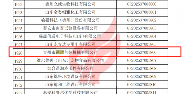 青州市通達包裝機械有限公司在入選名單之內,彰顯了青州市通達包裝機械有限公司在科技成果轉化能力、研發組織管理水平及成長性等方面達到國家企業認定標準。